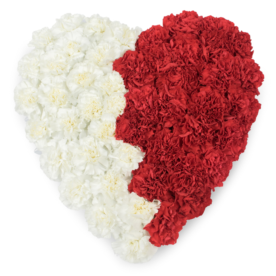 Send a message of grace and affection with our Heart of Mixed Carnations bouquet by Handy Flowers. This elegant arrangement features a harmonious mix of white and red carnations, artfully formed into a heart to symbolize your sincere emotions.