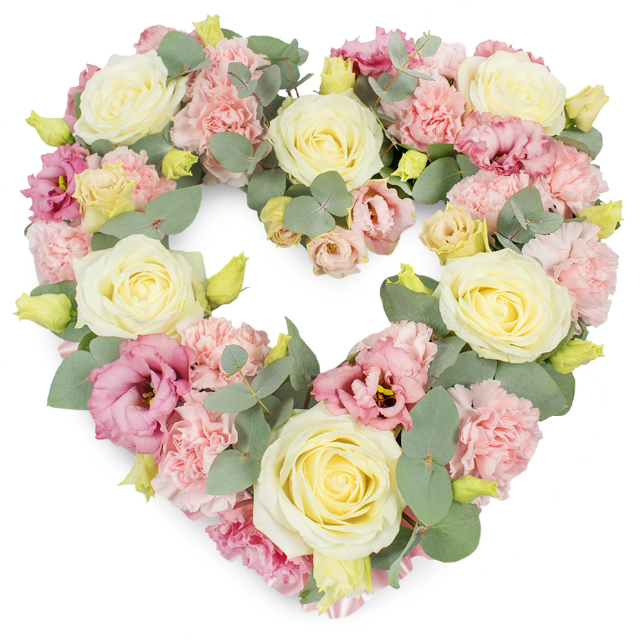 Honor your loved ones with our beautiful open heart memorial bouquet. This stunning arrangement features a harmonious blend of white roses, soft pink carnations, delicate pink lisianthus, and eucalyptus leaves, thoughtfully arranged to symbolize love and remembrance.