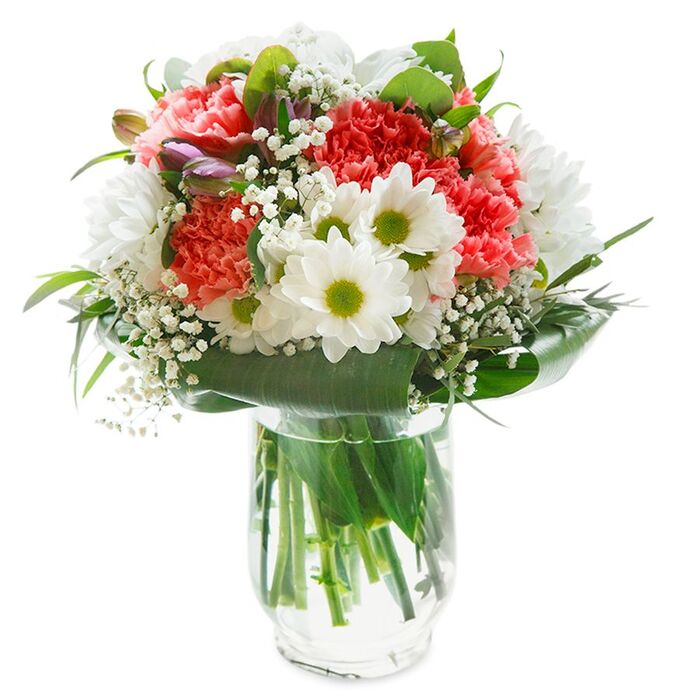 There's a buoyant spirit in this cheerful bouquet, hand-gathered and cradled within a sleek, white gift bag - the kind you might present to celebrate a new beginning in Merton or to brighten a neighbour's afternoon. The coral and red carnations are plush and exuberant, their frilled petals tumbling together in a dance of warmth and subtle, sweet fragrance. Juxtaposed among them, crisp white daisies with sunlit lime centers beam their joy, evoking the fresh, hopeful blooms found along the peaceful lanes of Raynes Park. Wispy clouds of white baby's breath meander throughout, lending a playful innocence and softening the palette, while lush, deep green leaves wrap the base, imparting structure and vibrancy. Hints of unopened, purple-blushed buds peek out on the left, quietly suggesting future blooms and the promise of more to come. The entire arrangement sits upright, expertly crafted, and glows under natural lighting that accentuates every colour and nuanced texture. With its sturdy ribbon handles and ready-to-gift form, this bouquet expresses sincerity and seasonal abundance - expertly designed for moments of celebration, whether it's a birthday, an anniversary, or simply an act of kindness delivered from a local Merton florist. This Merton-inspired floral creation is a springtime celebration rendered in blooms-meticulously arranged with an artist's touch to reflect joy, renewal, and the beauty found in local gardens from Cannon Hill to Lower Morden. Central daisies beam with pure white petals and chartreuse hearts, gleaming with an inviting simplicity that calls to mind playful afternoons outside. These radiant flowers rest among coral-pink carnations, their plush, layered petals imparting depth and a soft, fluttering energy. Interspersed gypsophila lends an airy, almost whimsical lift, much like sunlight breaking through on a May morning. Eucalyptus leaves introduce gentle fragrance and a luminous green undertone, harmonizing with darker foliage that frames the playful round shape. Hidden alstroemeria buds, flushed with hints of purple and pink, complete the palette and promise fresh delights ahead. This bouquet, perfect for marking birthdays, anniversaries, or simply saying 'thank you,' offers calm exuberance-a heartfelt gesture prepared by Merton florists for same-day delivery, sure to brighten any space from Pollards Hill to Wimbledon Village. Capturing the airy optimism of a spring morning in Merton, this expertly arranged bouquet stands radiant in a clear glass vase, aglow against a pure white backdrop. At the heart of the arrangement, lush coral carnations burst forth with ruffled enthusiasm-their densely layered petals forming a tapestry of soft movement and joyous colour. Nestled among them, snowy-white chrysanthemums and bright daisies with yellow-green centres cast a fresh, uplifting light, much like sunshine filtering through local Merton parks. Wisps of delicate baby's breath weave between the more prominent blooms, adding a cloud-like softness and easing the arrangement's energetic lines. From one side, magenta alstroemeria buds peek out, hinting at blooms yet to unfold and lending a gentle complexity to the palette. All around, broad, glossy green leaves and slender foliage cradle the composition, offering grounding richness that draws the eye from the blossoms down to the water-filled vase, where verdant stems glisten. Even lighting ensures that every detail is revealed, without distraction, giving the bouquet a welcoming, open quality. Arranged with sensitivity and care, this floral display by Flower Delivery Merton is a perfect way to brighten a home, commemorate a special day, or send a quiet note of encouragement across the neighbourhood-a sensory gift that's as fresh and genuine as the area itself.